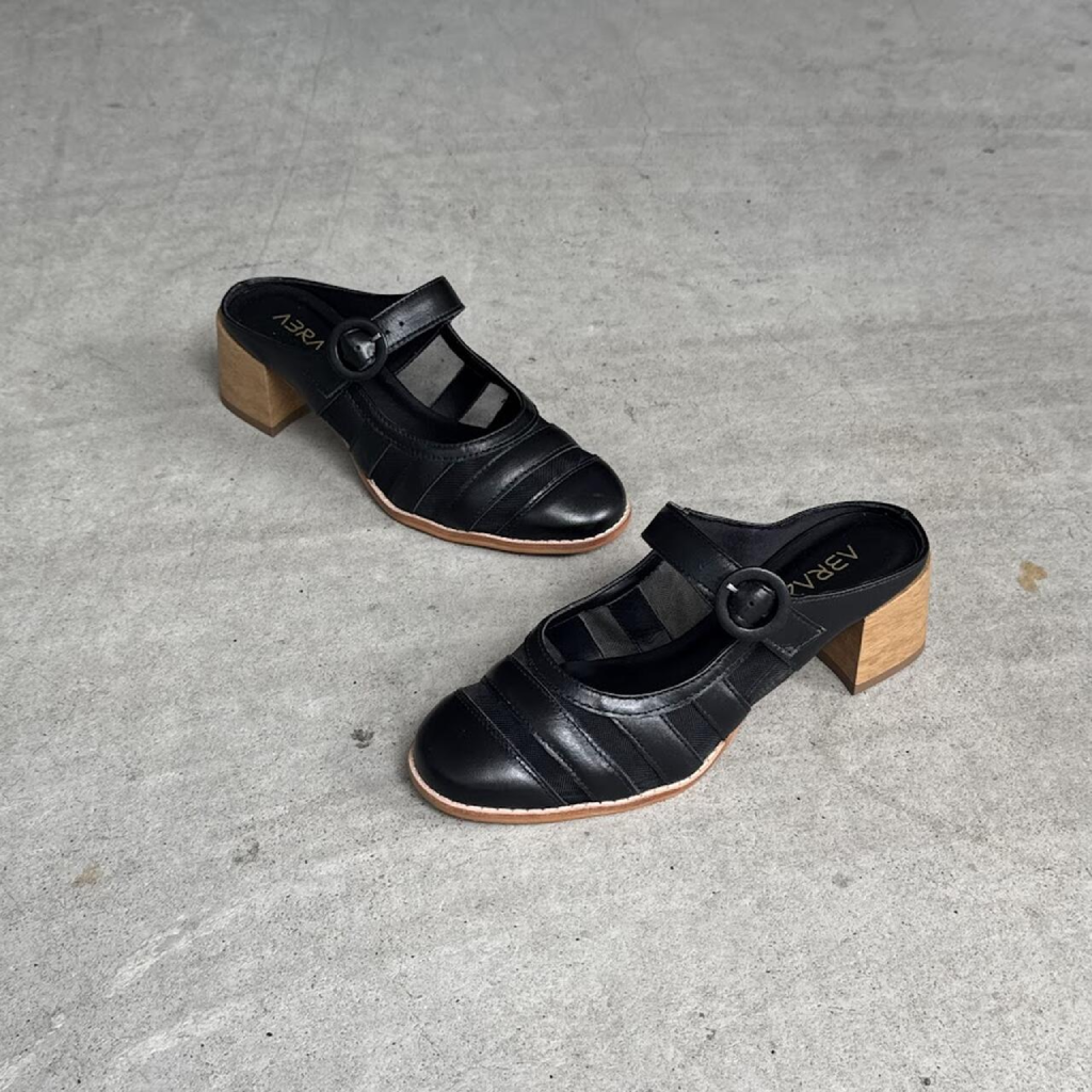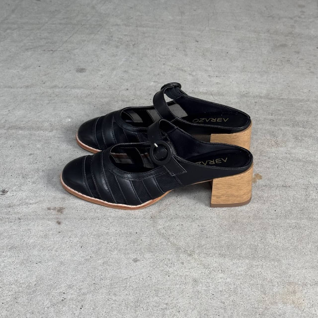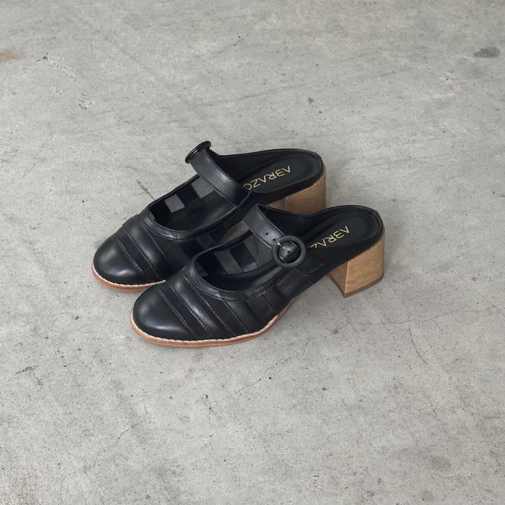 Cadedal feito em couro legítimo na cor preta e salto de madeira, na altura de 5 cm.